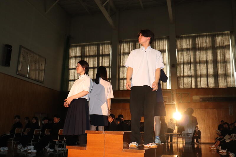 部活動紹介では各部が一人でも多くの1年生に入ってもらおうと個性的な紹介で会場を盛り上げ、学校生活のルールや制服の着こなしについて、生徒会執行部の生徒たちがモデルとなり、1年生に丁寧に説明していました。新入生たちも少しずつ緊張が解けてきた様子でした。