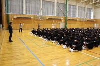 4月21日(火)3校時 明日から始まる第1学年の宿泊研修に向け、結団式を行いました。団長である教頭と1学年主任からあいさつがあり、生徒を代表して1年1組 藤田 啓人さんが3日間の目標を語りました。